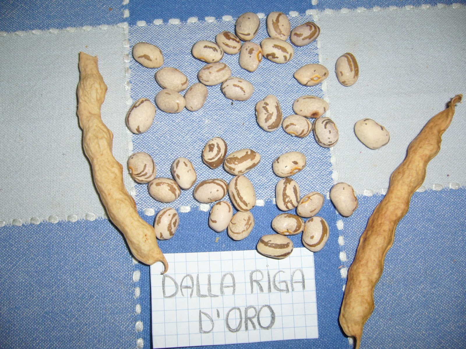 fagiolo RIGA d’ ORO è un borlotto molto coltivato in valbelluna (ma anche in altre zone es. Posina). Fagiolo alto, molto produttivo. Fiori bianchi e baccello tendenzialmente striato di rosso. Fagiolo tondeggiante (ma varia facilmente di forma) color crema di fondo con una striatura (a chiocciola) color giallo scuro-marrone. Buccia fine, molto buono
